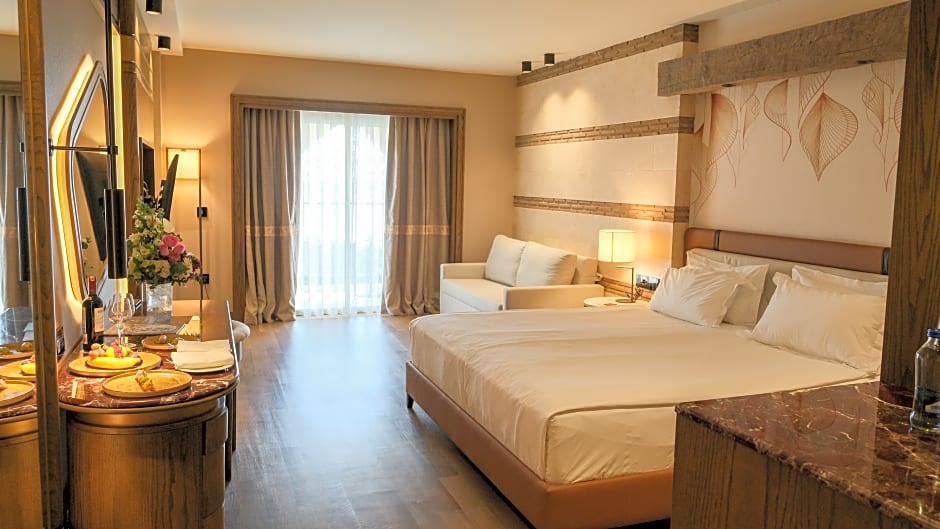 JUNIOR SUITE SEA VIEW is 517 square feet and includes a king-size bed 150-183 width plus a sofa bed plus balcony, hairdryer, tea and coffee making facilities , and bathrobes and is Wheelchair-accessible.
