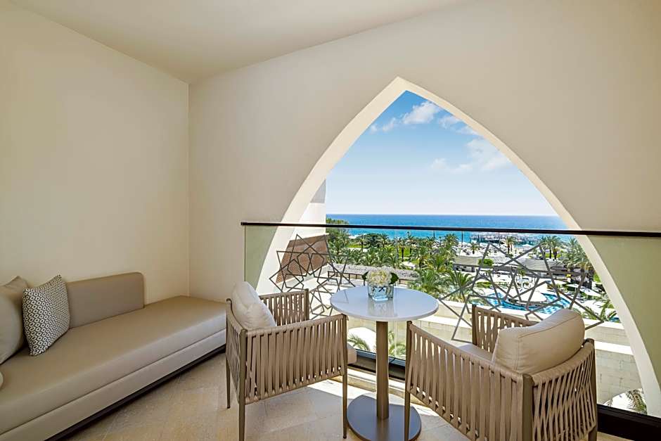 One Bedroom Sea View is 753 square feet and includes a double bed 131-150 width plus living room, balcony, extra beds on demand, desk, tea and coffee making facilities , and bathrobes and is Wheelchair-accessible.